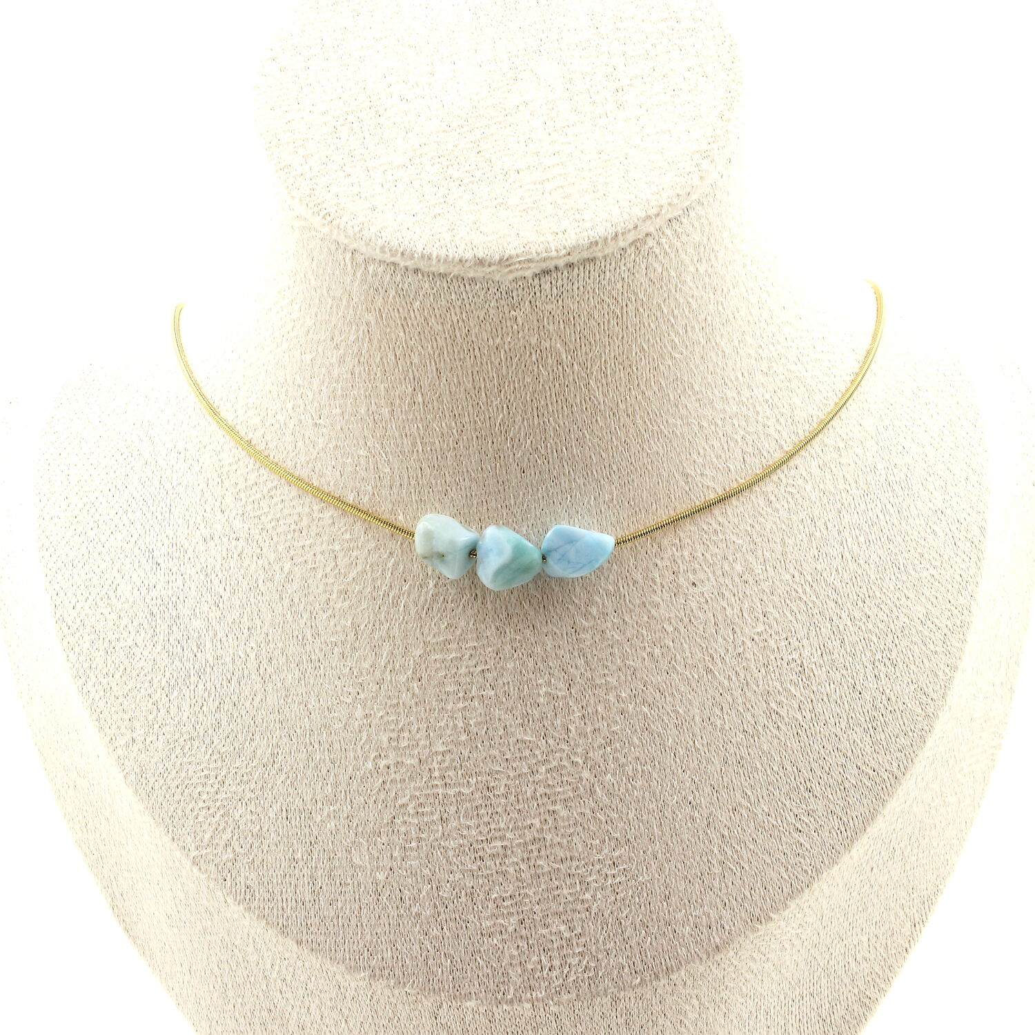 Larimar from the Dominican Republic 3 beads necklace. Golden stainless steel chain