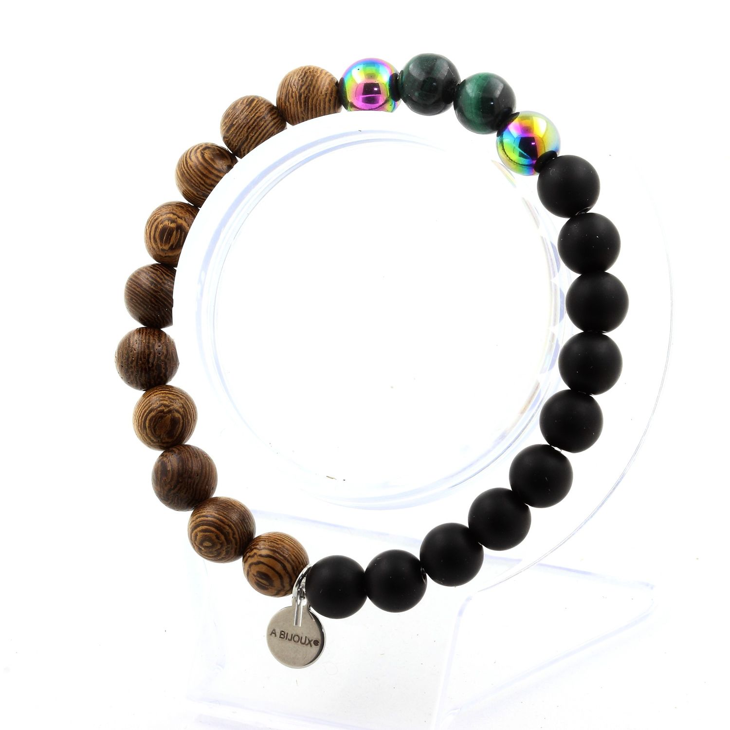Malachite from Congo + multicolor Hematite + Matte Black Onyx + Wood Bracelet 8 mm Beads.