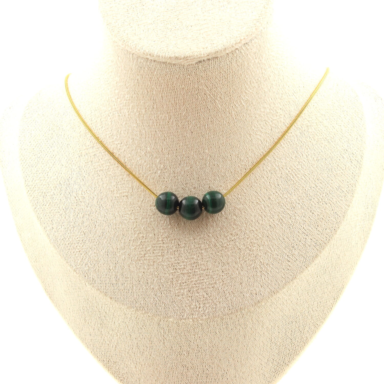 Malachite from Congo quality 7A 8 mm 3 beads necklace, golden stainless steel chain length 45 cm. We can make it to your length on request. Made in France in our A Bijoux workshop. Delivered in a box pouch. Necklace for women, men, children. Discover more than 1000 models of necklaces made by the A Bijoux brand with new arrivals every day.