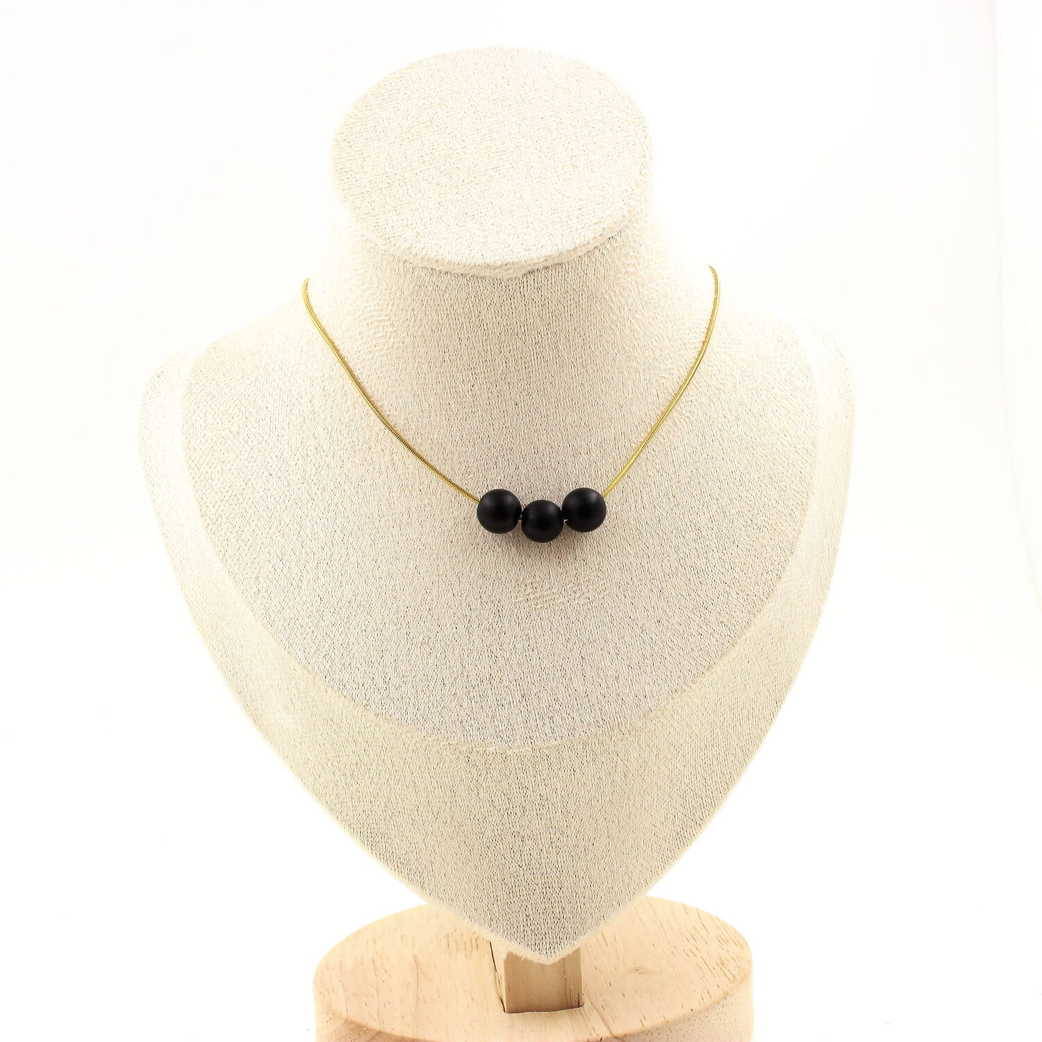 Matte black Onyx 8 mm 3 beads necklace, golden stainless steel chain length 45 cm. We can make it to your length on request. Made in France in our A Bijoux workshop. Delivered in a box pouch. Necklace for women, men, children. Discover more than 1000 models of necklaces made by the A Bijoux brand with new arrivals every day.