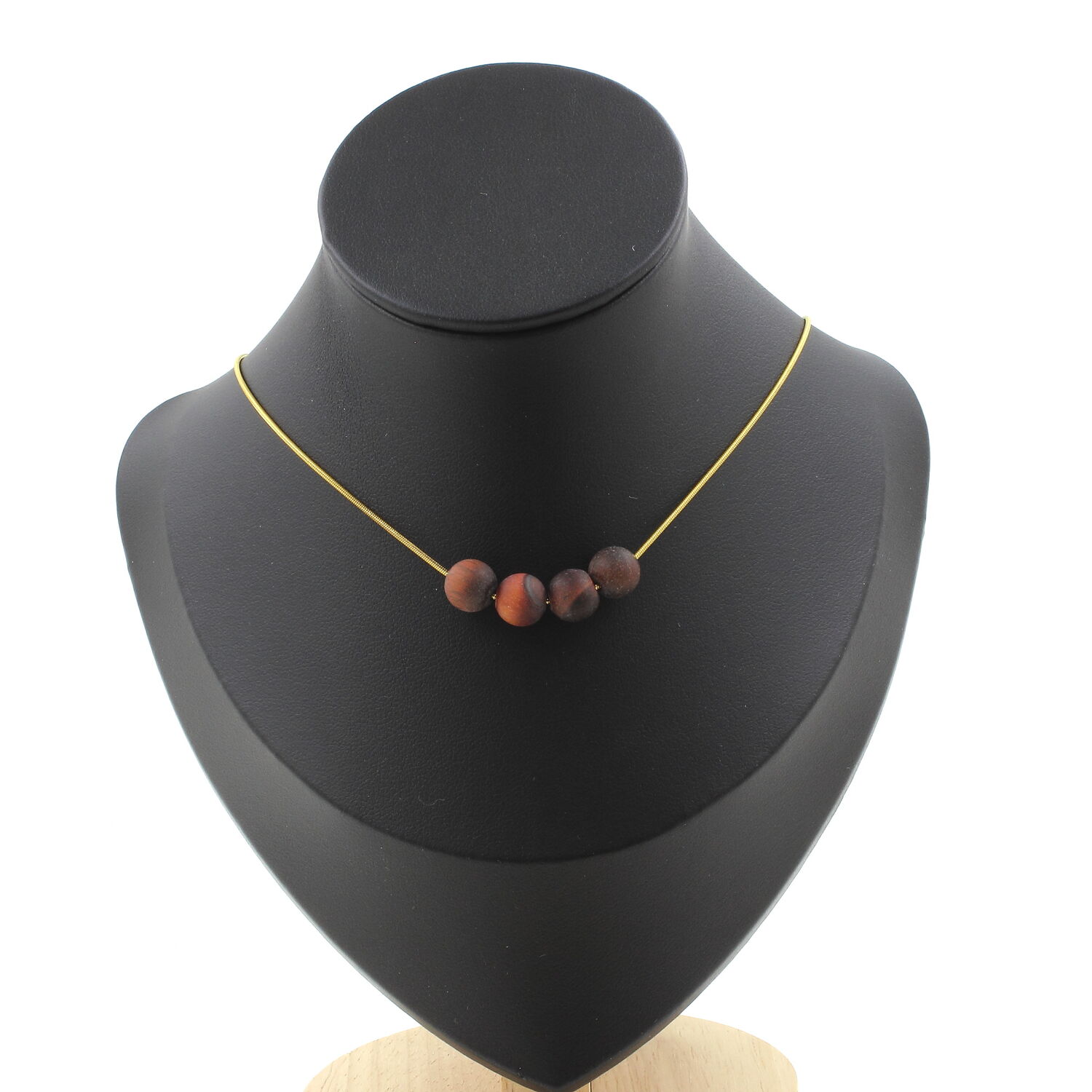Matte red Tiger's Eye 8 mm 4 beads necklace, golden stainless steel chain length 45 cm. We can make it to your length on request. Made in France in our A Bijoux workshop. Delivered in a box pouch. Necklace for women, men, children. Discover more than 1000 models of necklaces made by the A Bijoux brand with new arrivals every day.