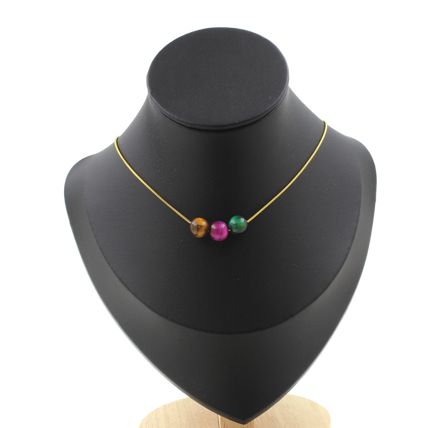 Multicolored Tiger's Eye 8 mm 3 beads necklace, golden stainless steel chain length 45 cm. We can make it to your length on request. Made in France in our A Bijoux workshop. Delivered in a box pouch. Necklace for women, men, children. Discover more than 1000 models of necklaces made by the A Bijoux brand with new arrivals every day.