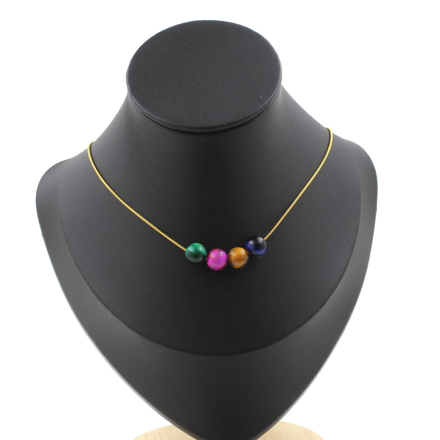 Multicolored Tiger's Eye 8 mm 4 beads necklace, golden stainless steel chain length 45 cm. We can make it to your length on request. Made in France in our A Bijoux workshop. Delivered in a box pouch. Necklace for women, men, children. Discover more than 1000 models of necklaces made by the A Bijoux brand with new arrivals every day.
