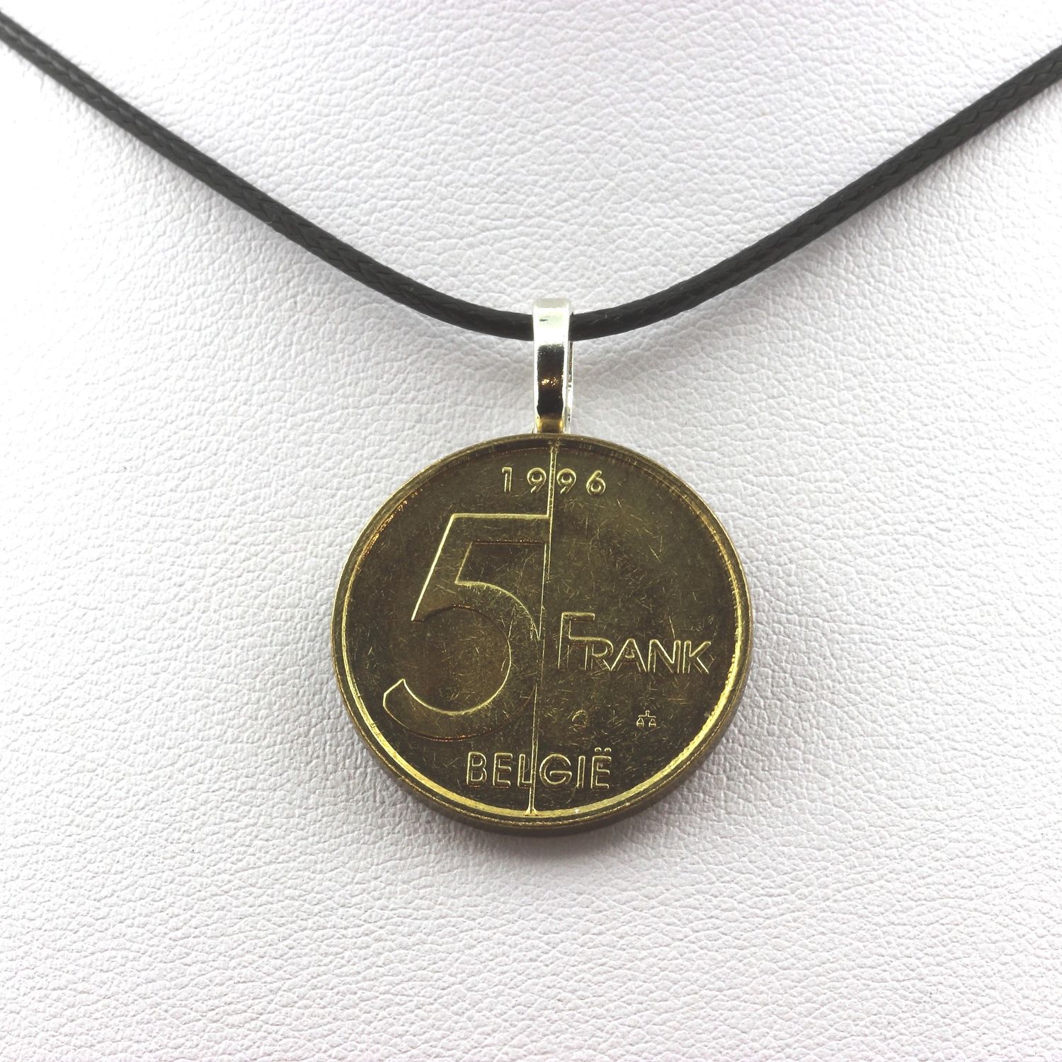 Authentic Coin Pendant Belgium 5 francs - Albert II + black leather cord (length 45 to 50 cm).