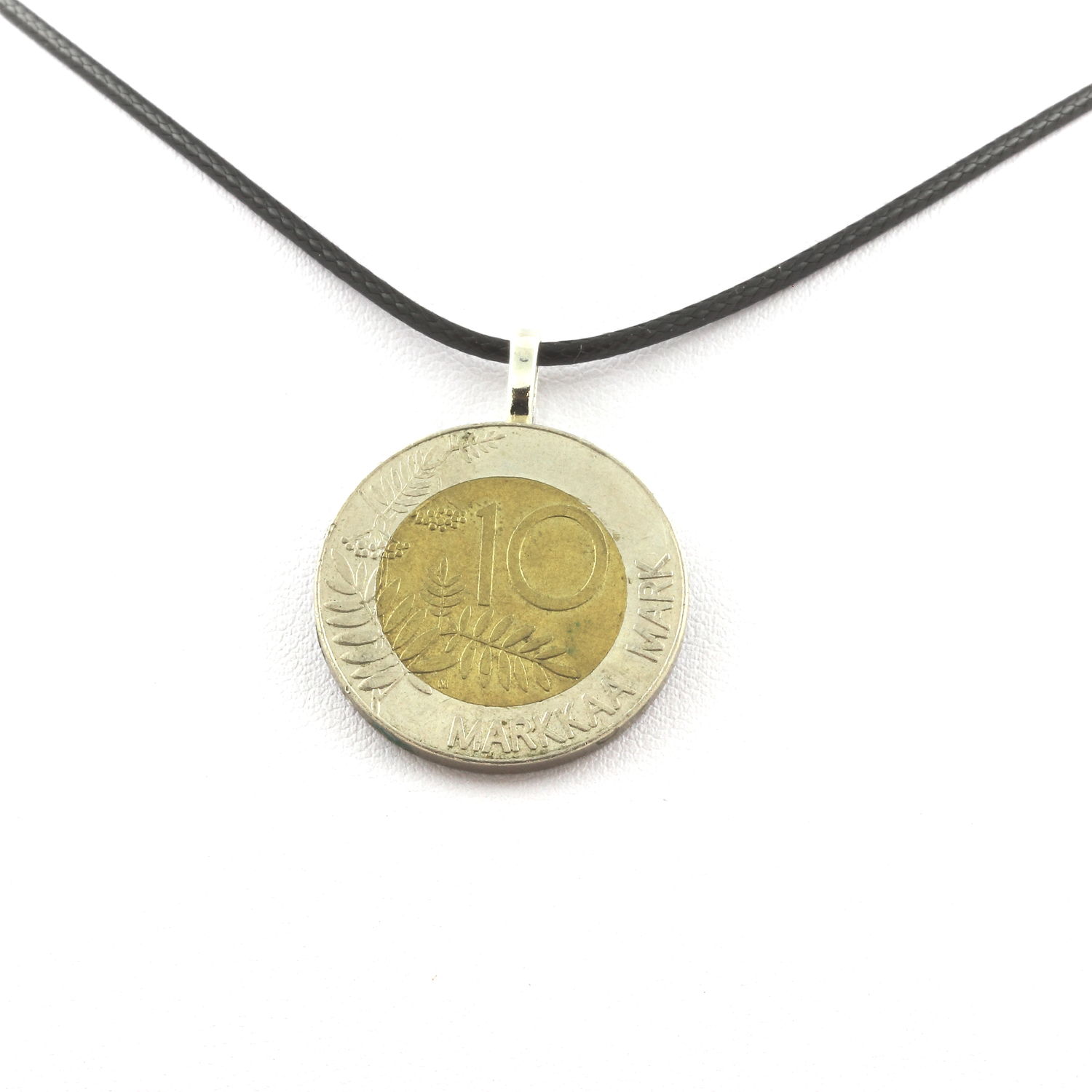 Authentic Coin Pendant Finland 10 marks + black leather cord (length 45 to 50 cm).