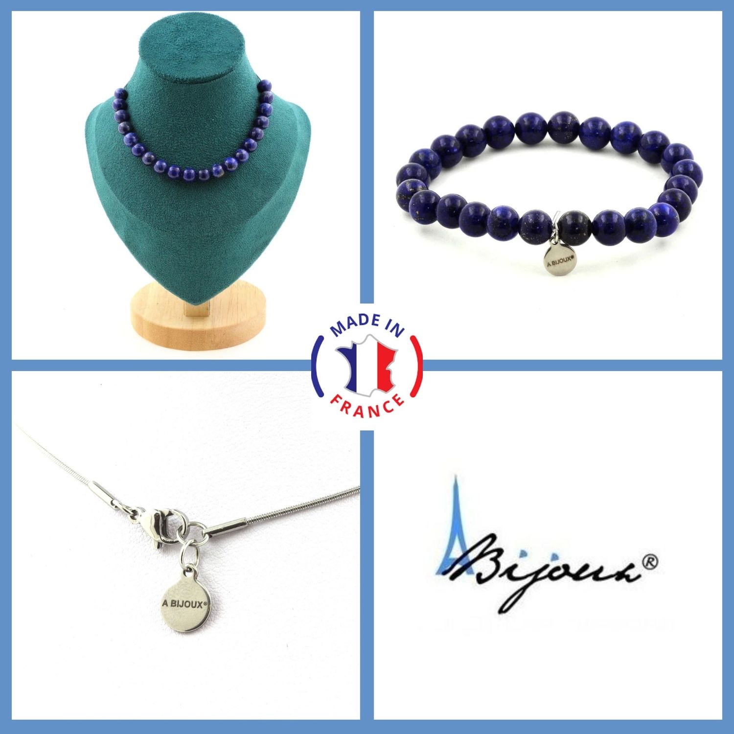Parure bijoux Bracelet Collier 20 Perles Lapis Lazuli 8 mm. Chaine en acier inoxydable.