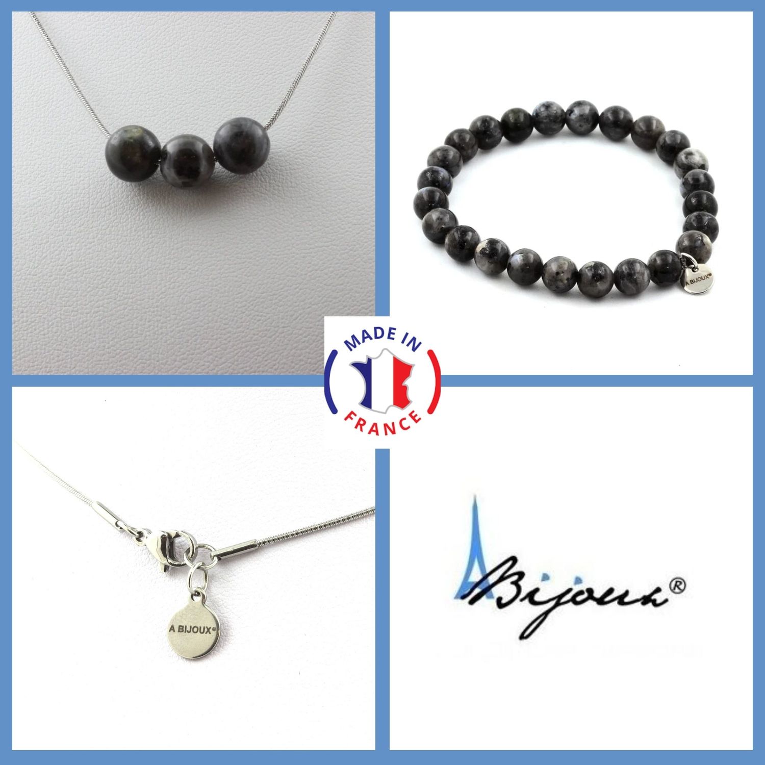 Parure bijoux Bracelet Collier 3 Perles Labradorite 8 mm. Chaine en acier inoxydable.