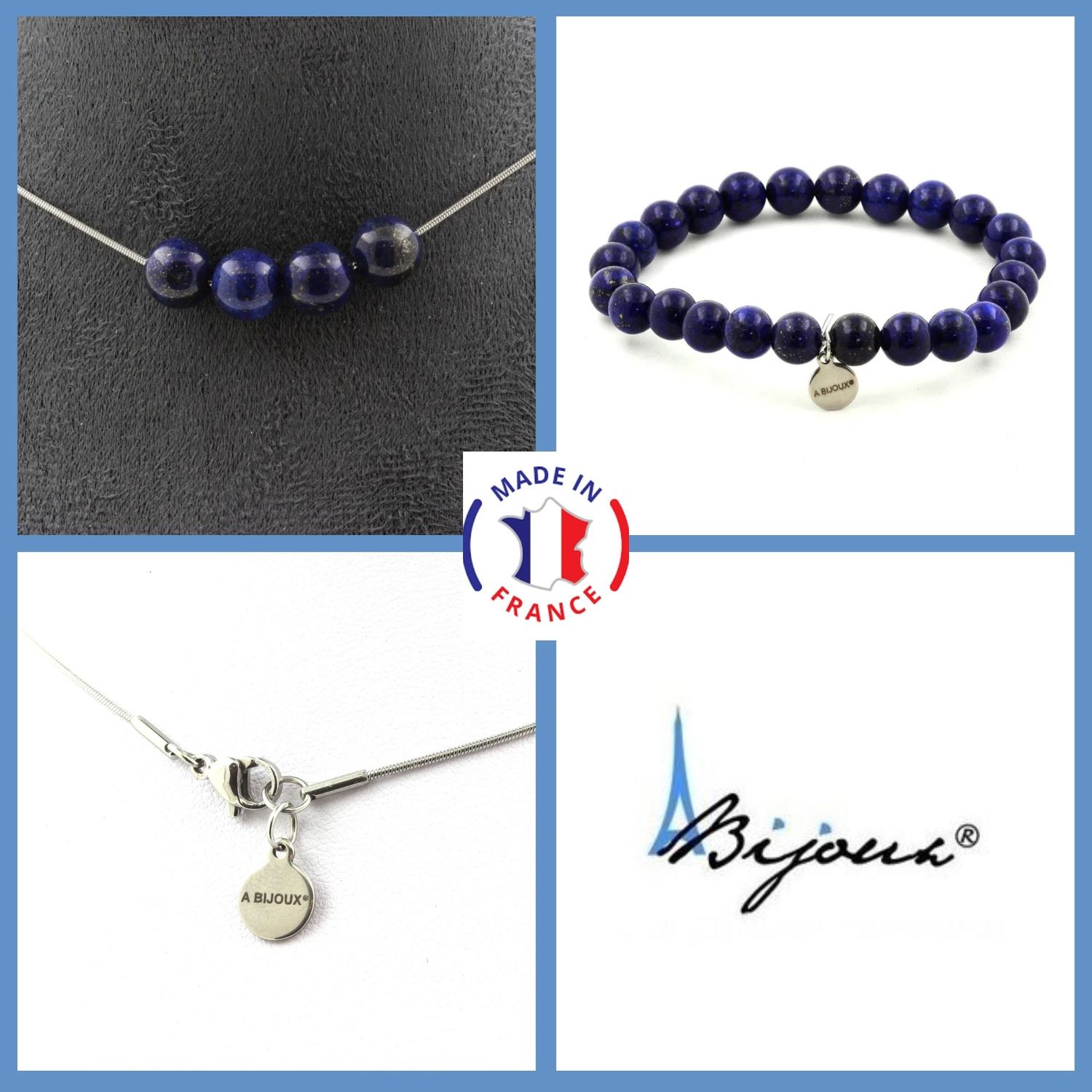 Parure bijoux Bracelet Collier 4 Perles Lapis Lazuli 8 mm. Chaine en acier inoxydable.