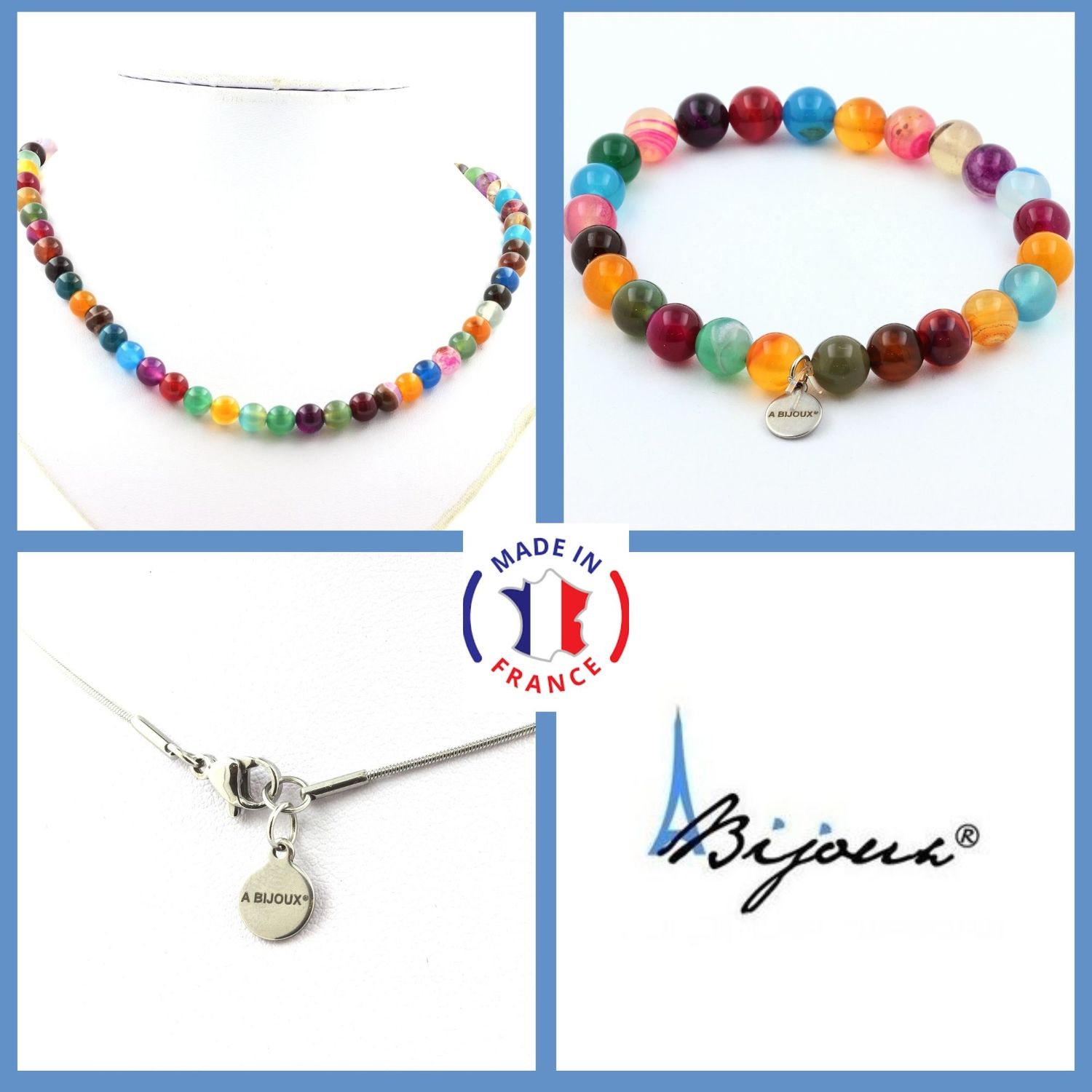 Parure bijoux Bracelet Collier perles Agate rubanée multicolore 8 mm. Chaine en acier inoxydable.