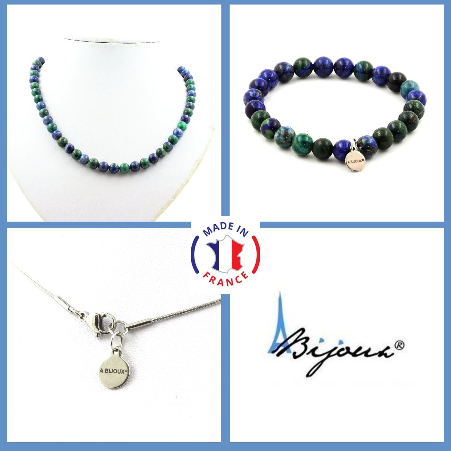 Parure bijoux Bracelet Collier perles Azurite Chrysocolle 8 mm. Chaine en acier inoxydable.