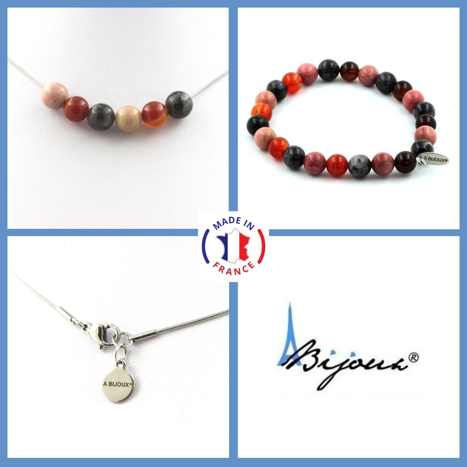 Parure bijoux Bracelet Collier Perles Rhodonite + Labradorite + Agate rubanée 8 mm. Chaine en acier inoxydable.