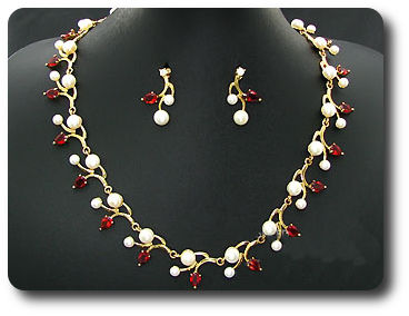 Pearl & Red Ruby Necklace + Earrings