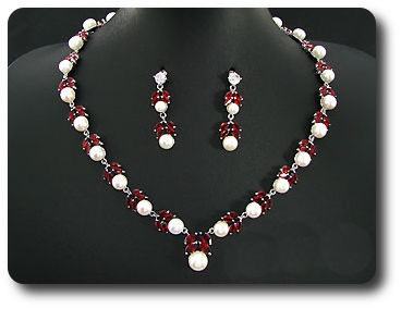 Pearl & Red Ruby Necklace + Earrings