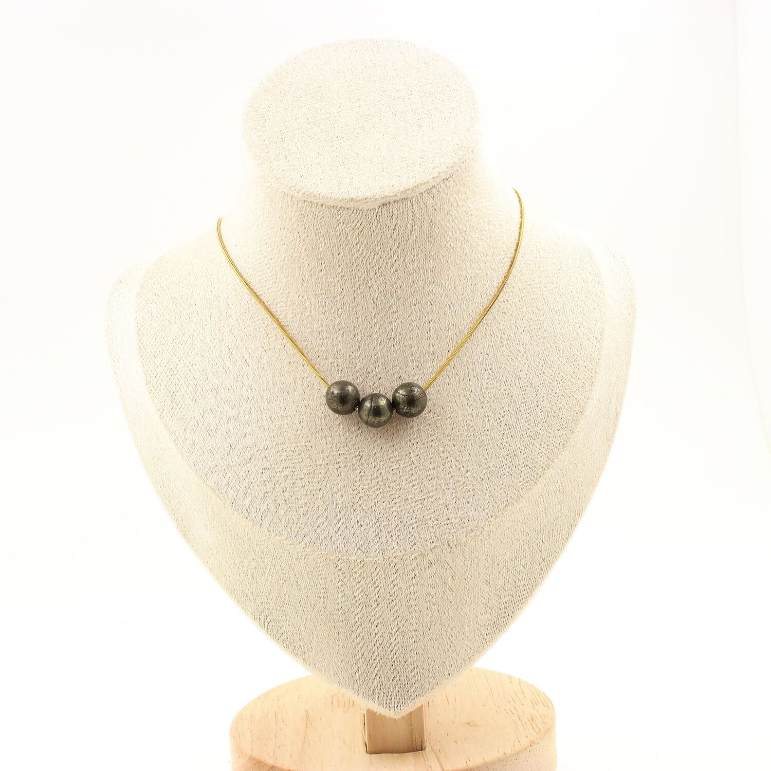 Pyrite from Spain 8 mm 3 beads necklace, golden stainless steel chain length 45 cm. We can make it to your length on request. Made in France in our A Bijoux workshop. Delivered in a box pouch. Necklace for women, men, children. Discover more than 1000 models of necklaces made by the A Bijoux brand with new arrivals every day.