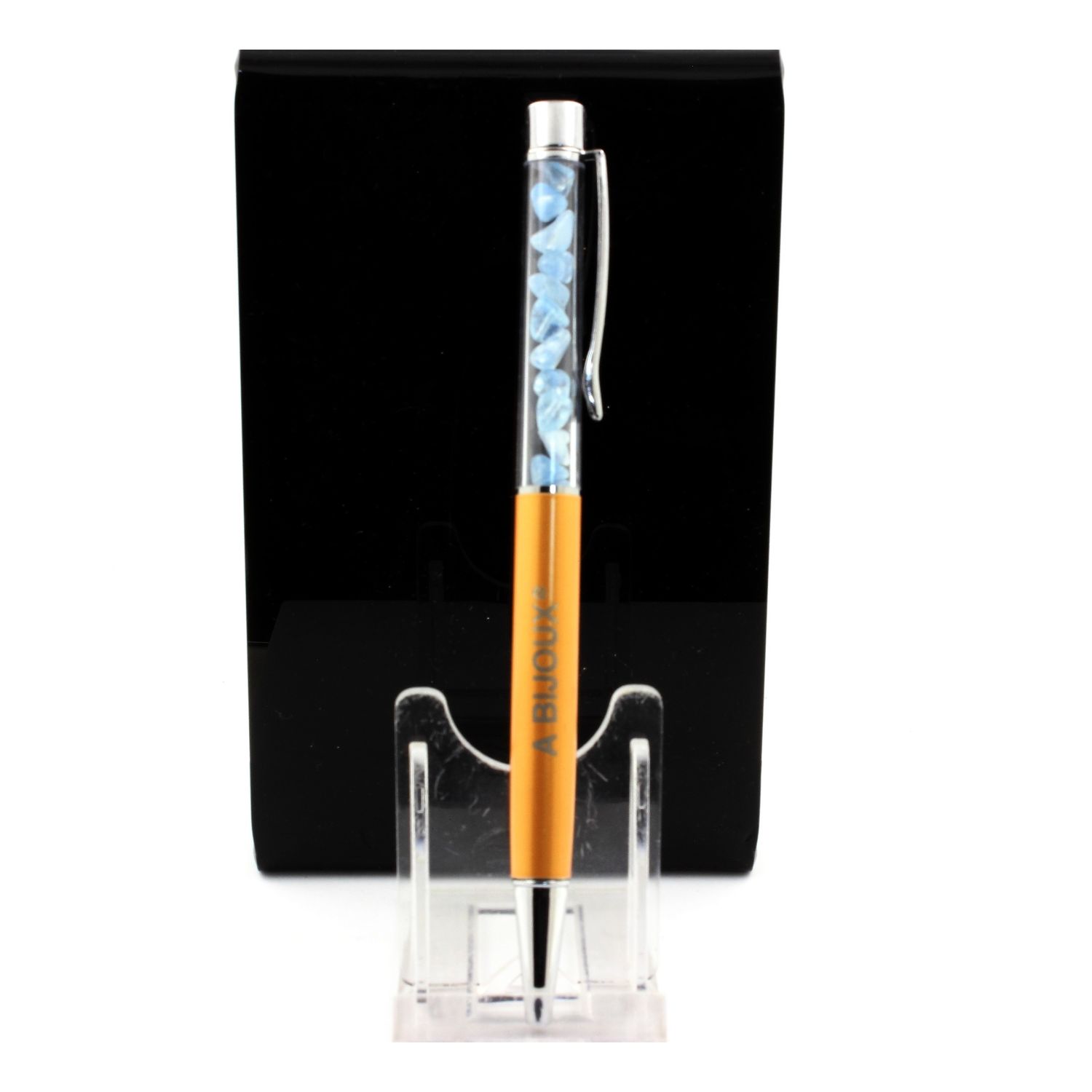 Natural Aquamarine mineral pen from Brazil. Quantity of stones varies depending on size. Pen available in several colors in our store. Black ink. Refillable pen. Delivered in a gift bag.