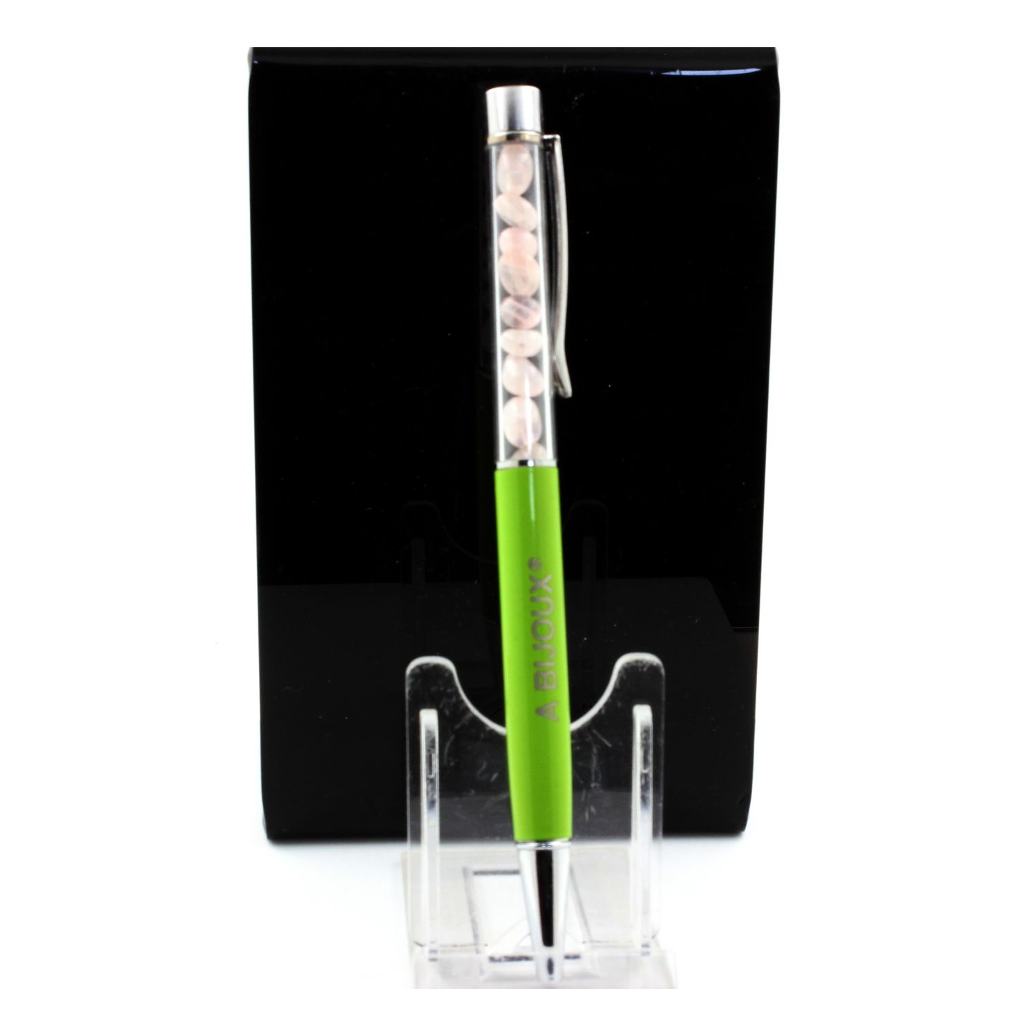Natural rose Quartz mineral pen from Brazil. Quantity of stones varies depending on size. Pen available in several colors in our store. Black ink. Refillable pen. Delivered in a gift bag.