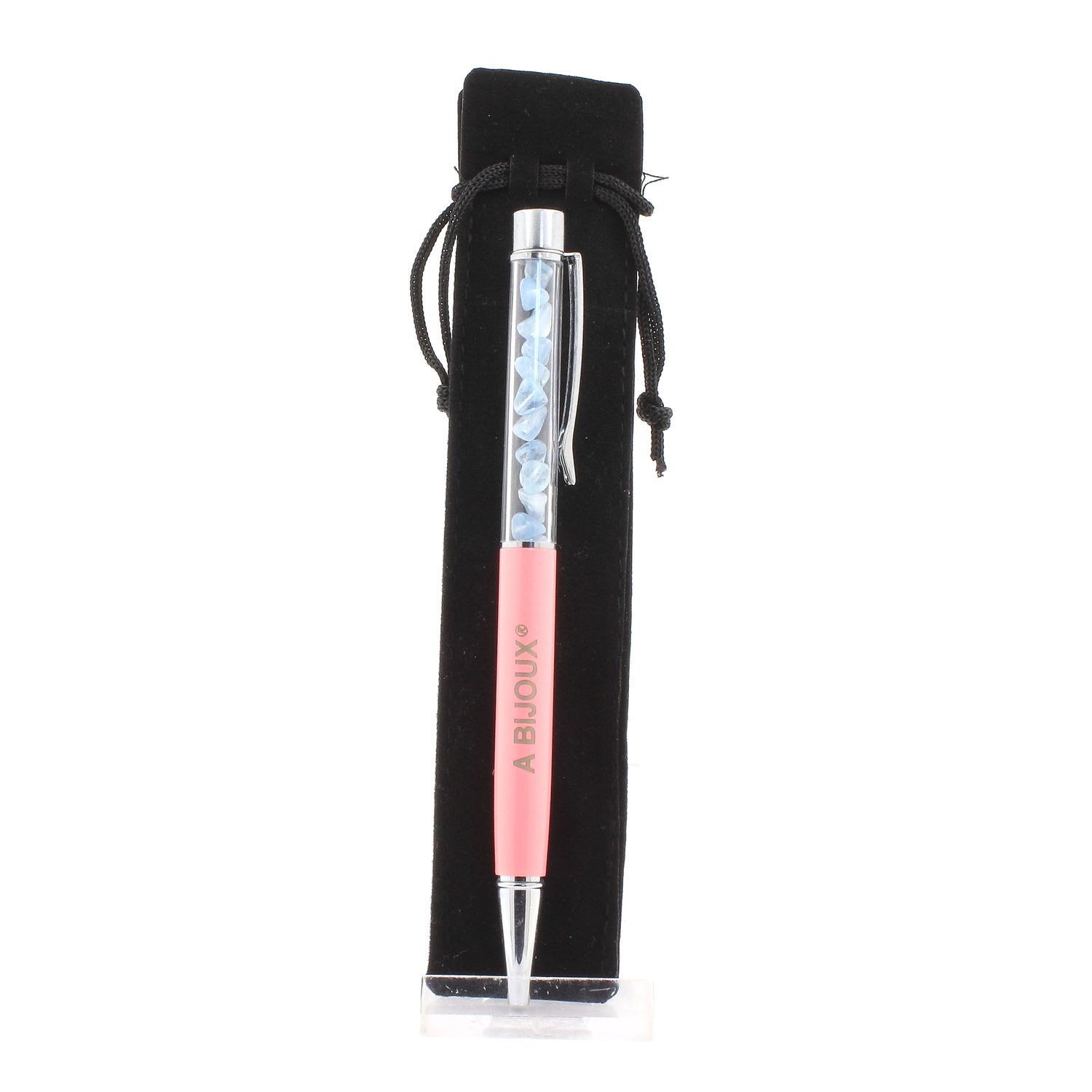 Natural Aquamarine mineral pen from Brazil. Quantity of stones varies depending on size. Pen available in several colors in our store. Black ink. Refillable pen. Delivered in a gift bag.