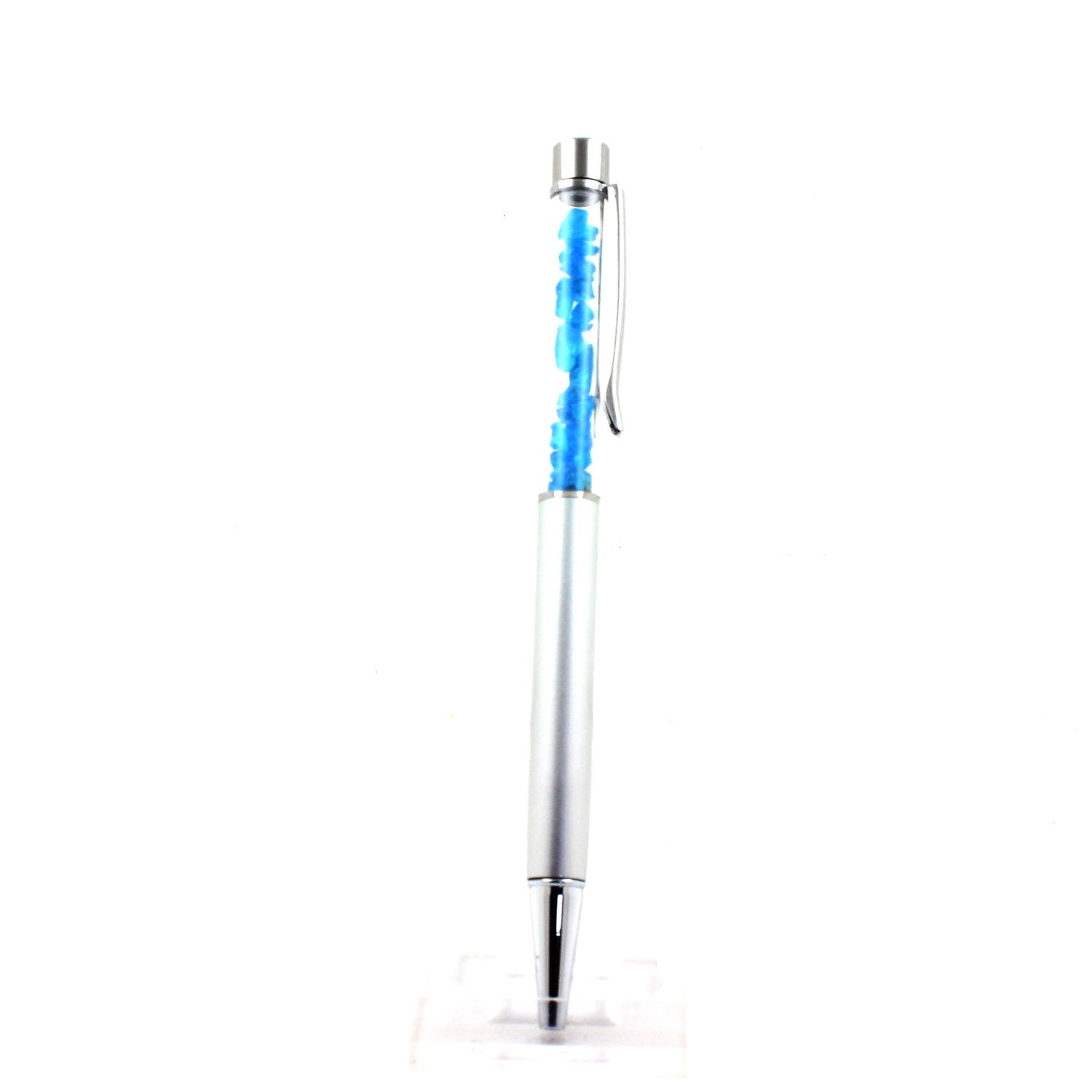 Natural neon blue Apatite crystal pen from Norcross-Madagascar Apatite Mine, Isoanala, Betroka, Anosy, Madagascar. Quantity of stones varies depending on size. Pen available in several colors in our store. Black ink. Refillable pen. Delivered in a gift bag.