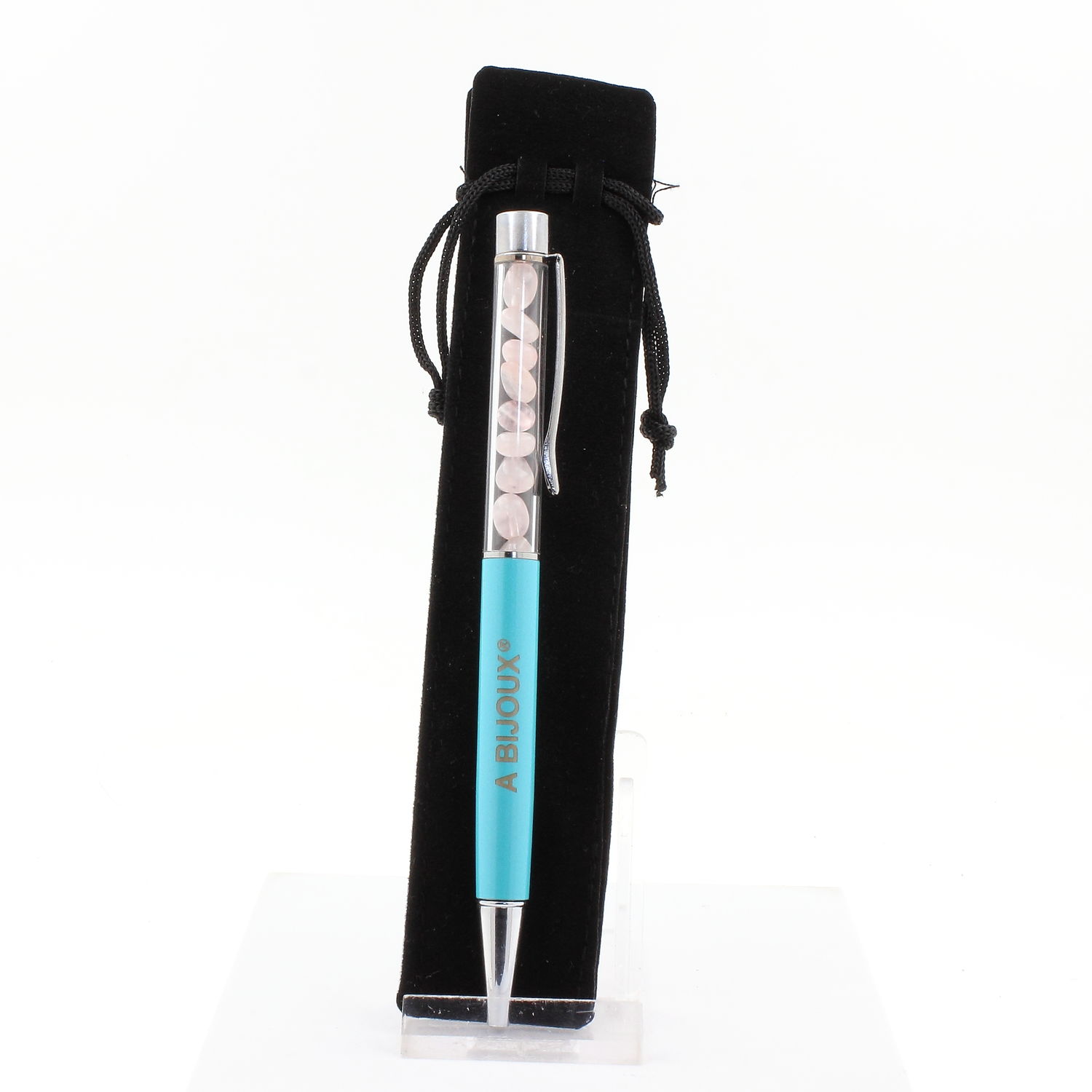 Natural rose Quartz mineral pen from Brazil. Quantity of stones varies depending on size. Pen available in several colors in our store. Black ink. Refillable pen. Delivered in a gift bag.