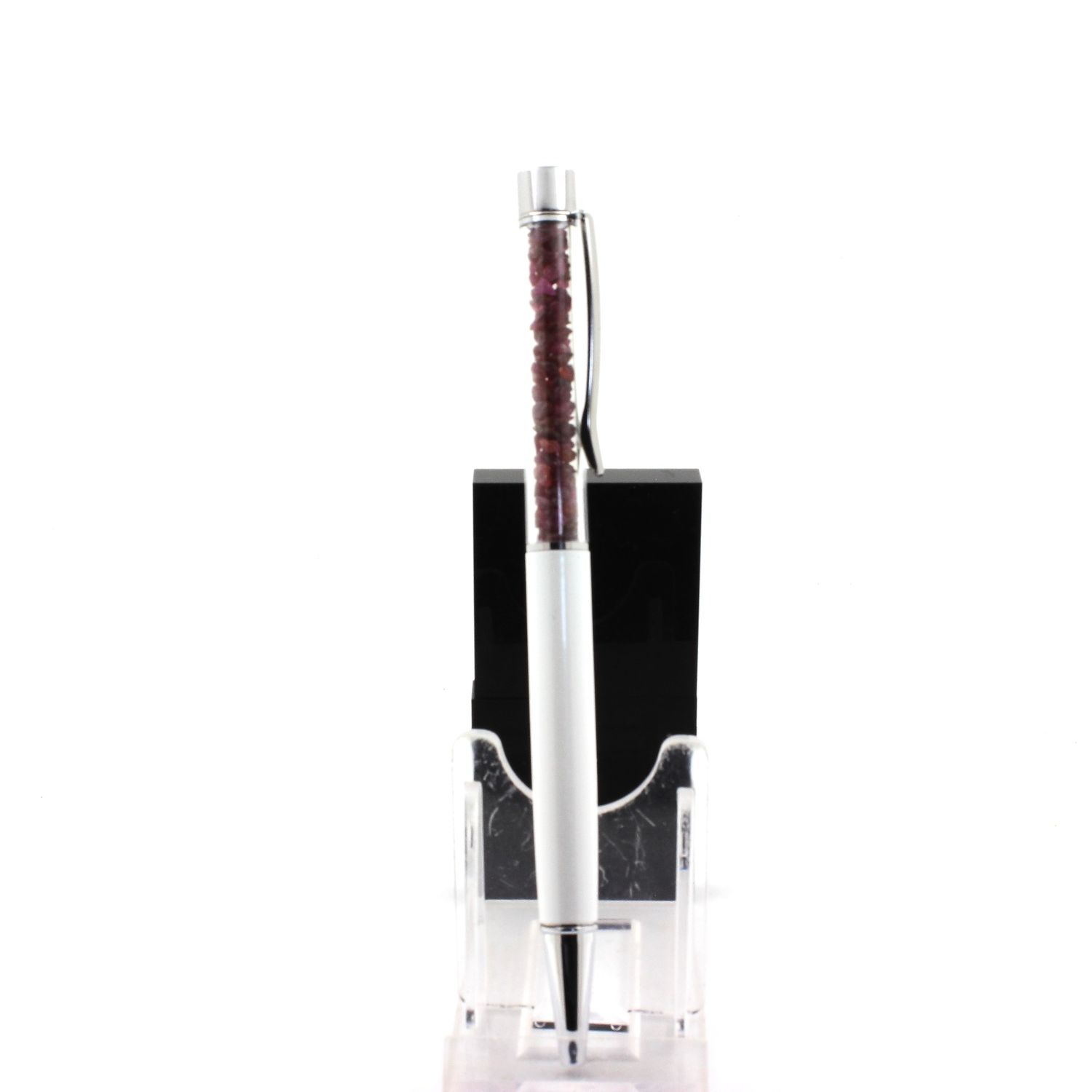 Natural Ruby crystal pen from Ambatondrazaka, Alaotra-Mangoro, Madagascar. Quantity of stones varies depending on size. Pen available in several colors in our store. Black ink. Refillable pen. Delivered in a gift bag.