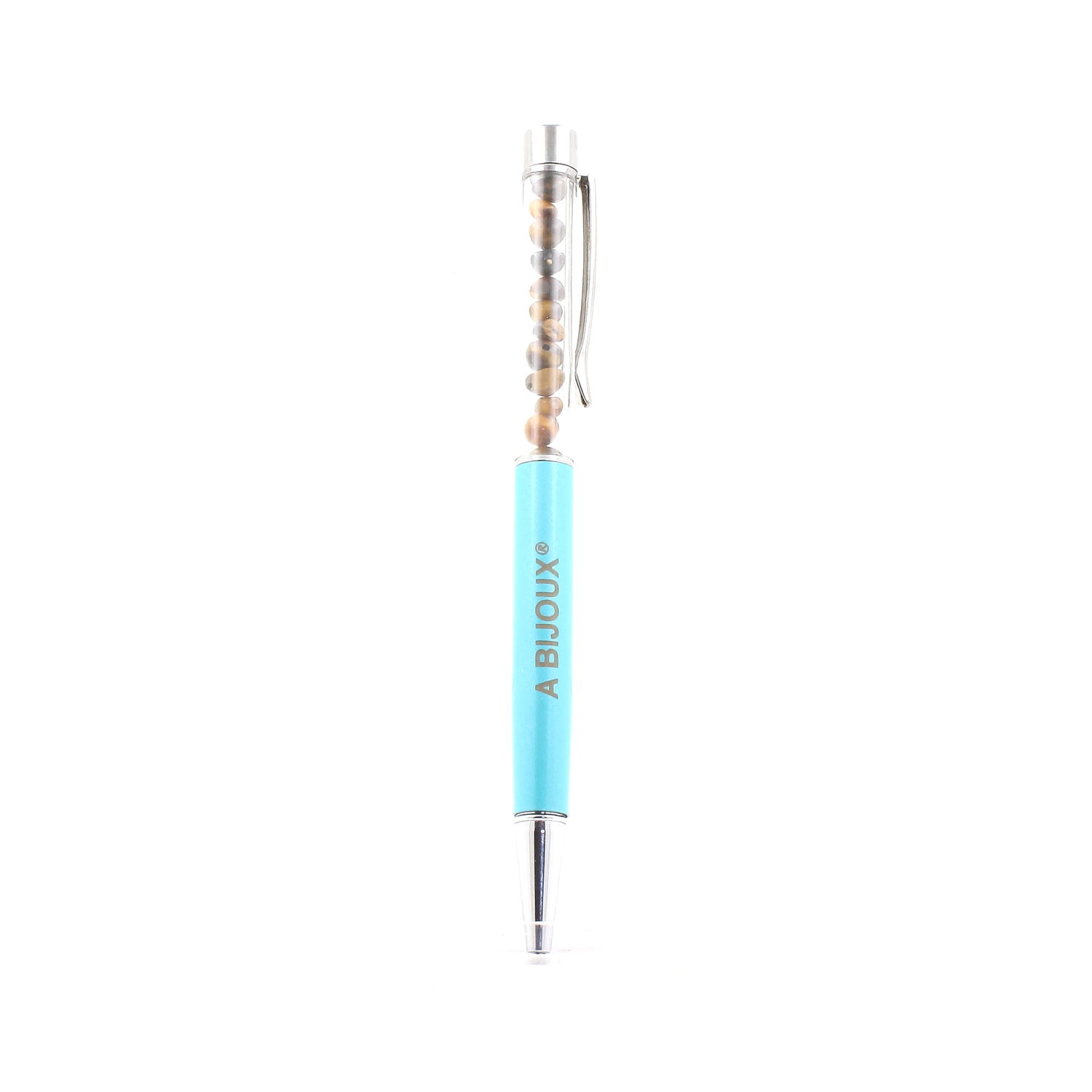 Natural Tiger's Eye mineral pen from South Africa. Quantity of stones varies depending on size. Pen available in several colors in our store. Black ink. Refillable pen. Delivered in a gift bag.