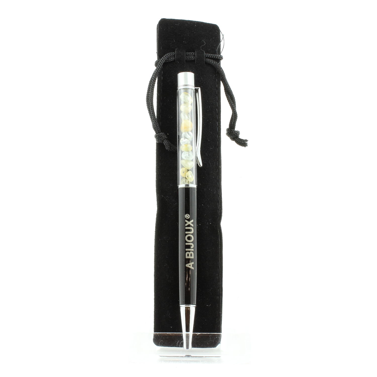 Natural Topaz mineral pen from Brazil. Pen available in several colors in our store. Black or blue ink of your choice. Refillable pen (with 2 free refills). Delivered in a gift bag. Discover more than 500 models of mineral pens in our store.