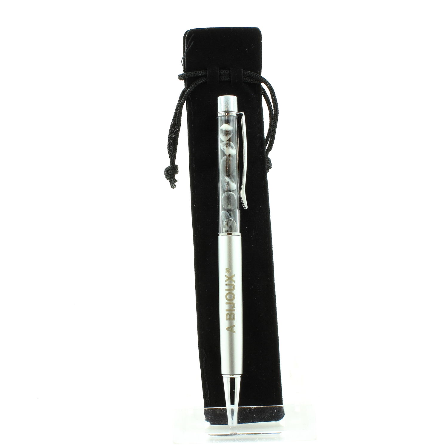 Natural Zebra jasper mineral pen from Brazil. Pen available in several colors in our store. Black or blue ink of your choice. Refillable pen (with 2 free refills). Delivered in a gift bag.