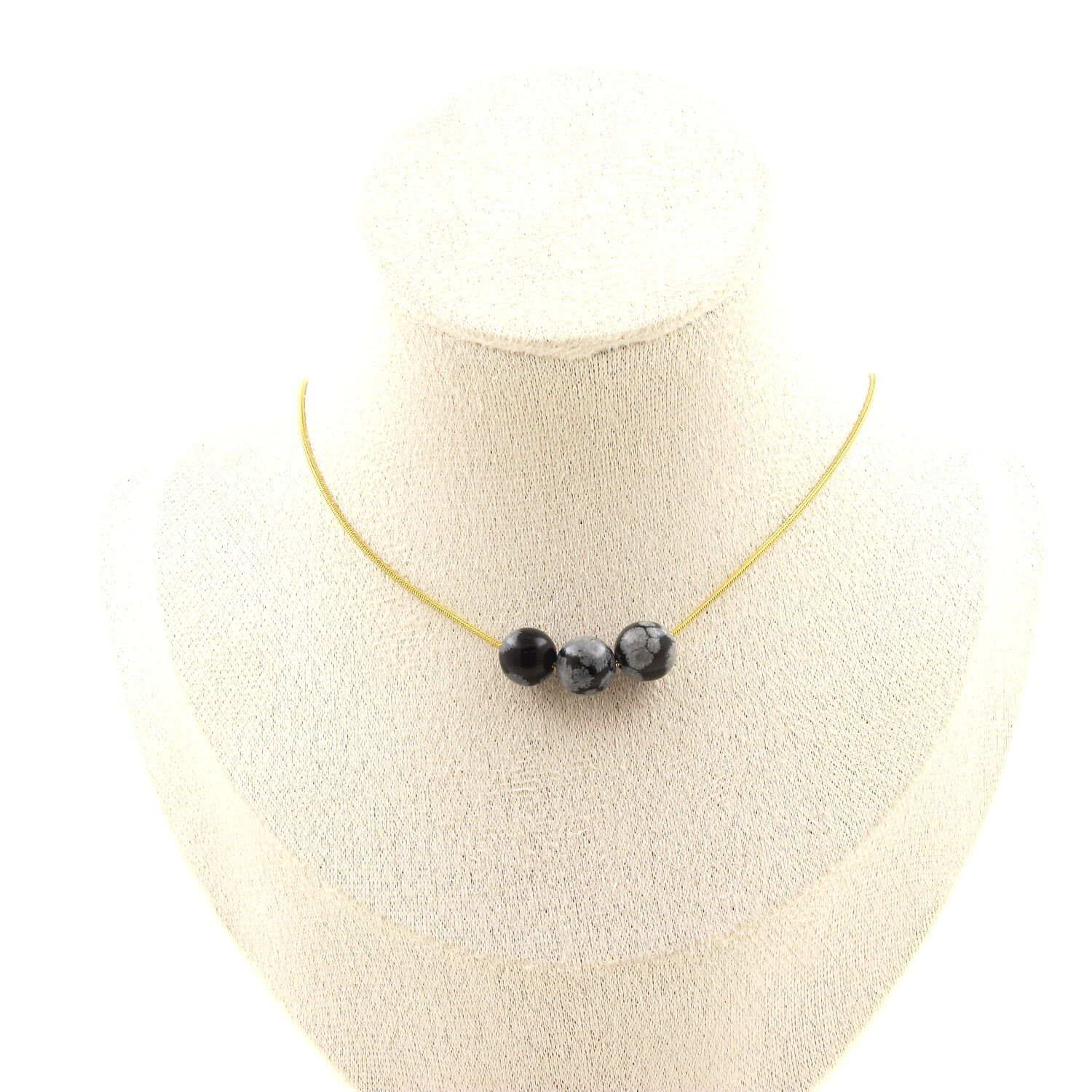Snowflake Obsidian 8 mm 3 beads necklace, golden stainless steel chain length 45 cm. We can make it to your length on request. Made in France in our A Bijoux workshop. Delivered in a box pouch. Necklace for women, men, children. Discover more than 1000 models of necklaces made by the A Bijoux brand with new arrivals every day.