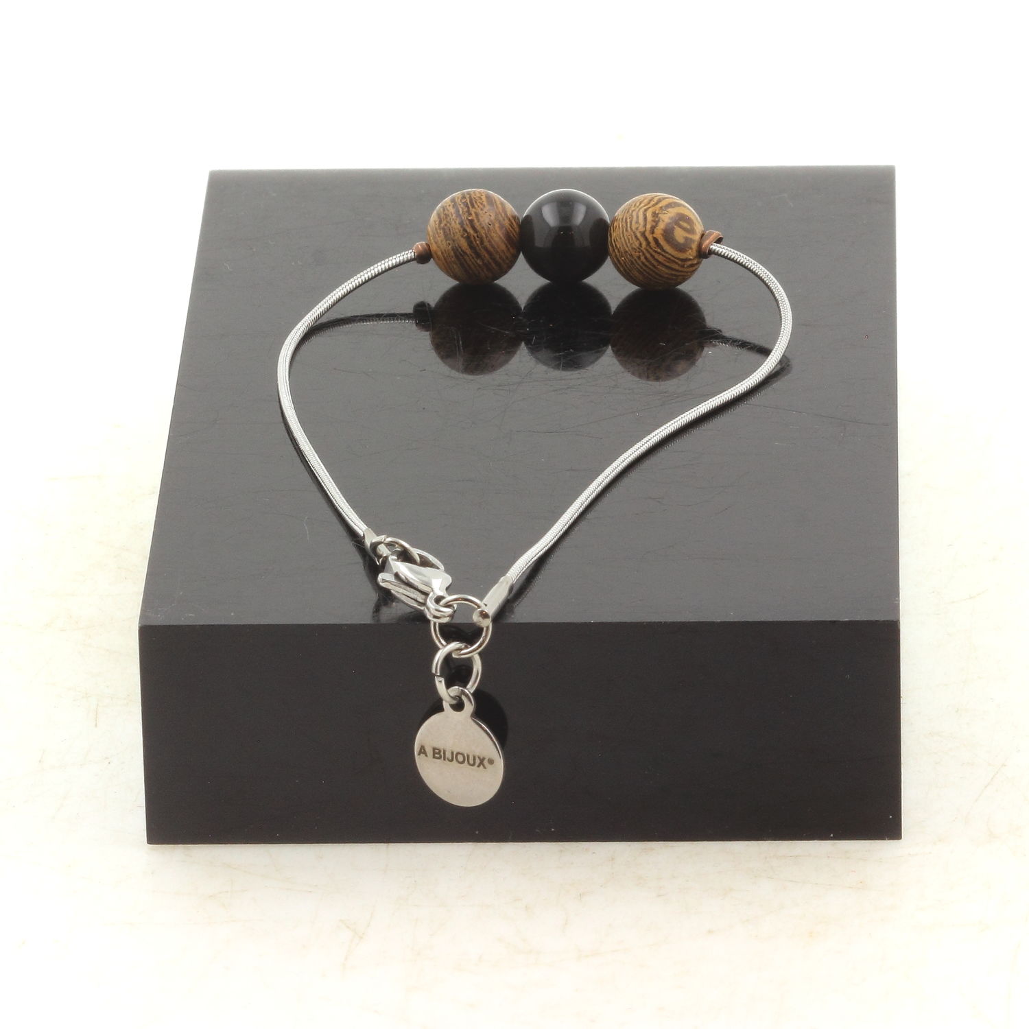 Stainless steel bracelet 1 Black Obsidian + wood 8 mm Bead.