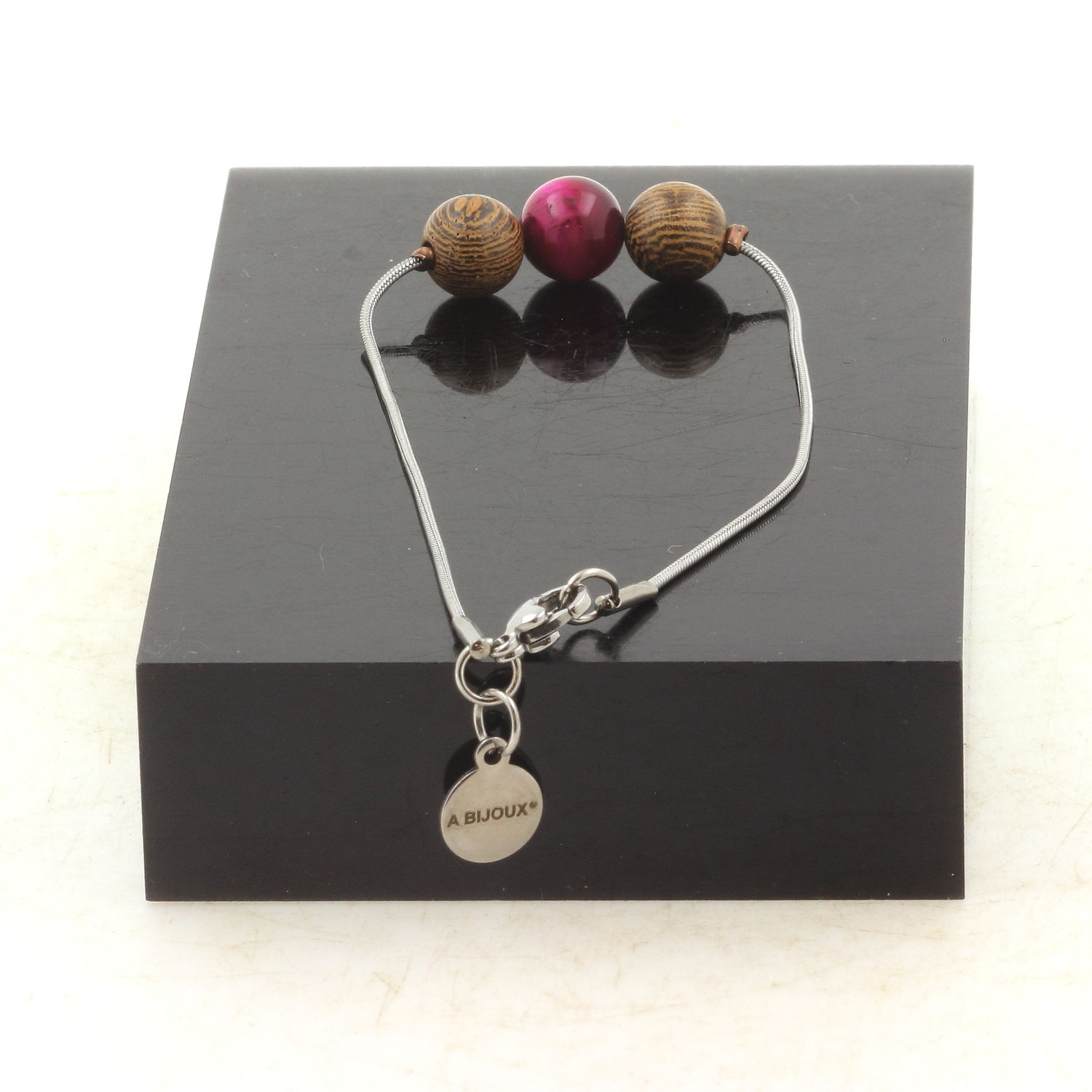 Stainless steel bracelet 1 Fuchsia Tiger's Eye + wood 8 mm Bead.