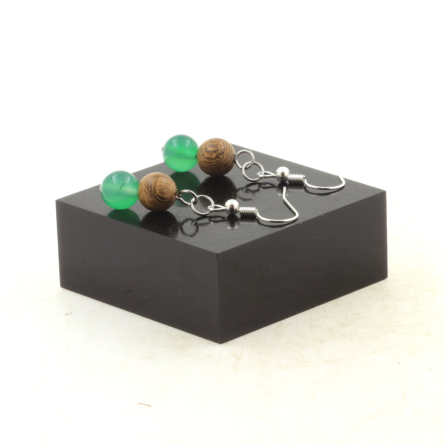 Stainless steel hypoallergenic Earrings Green Agate + wood 8 mm 2 Beads.