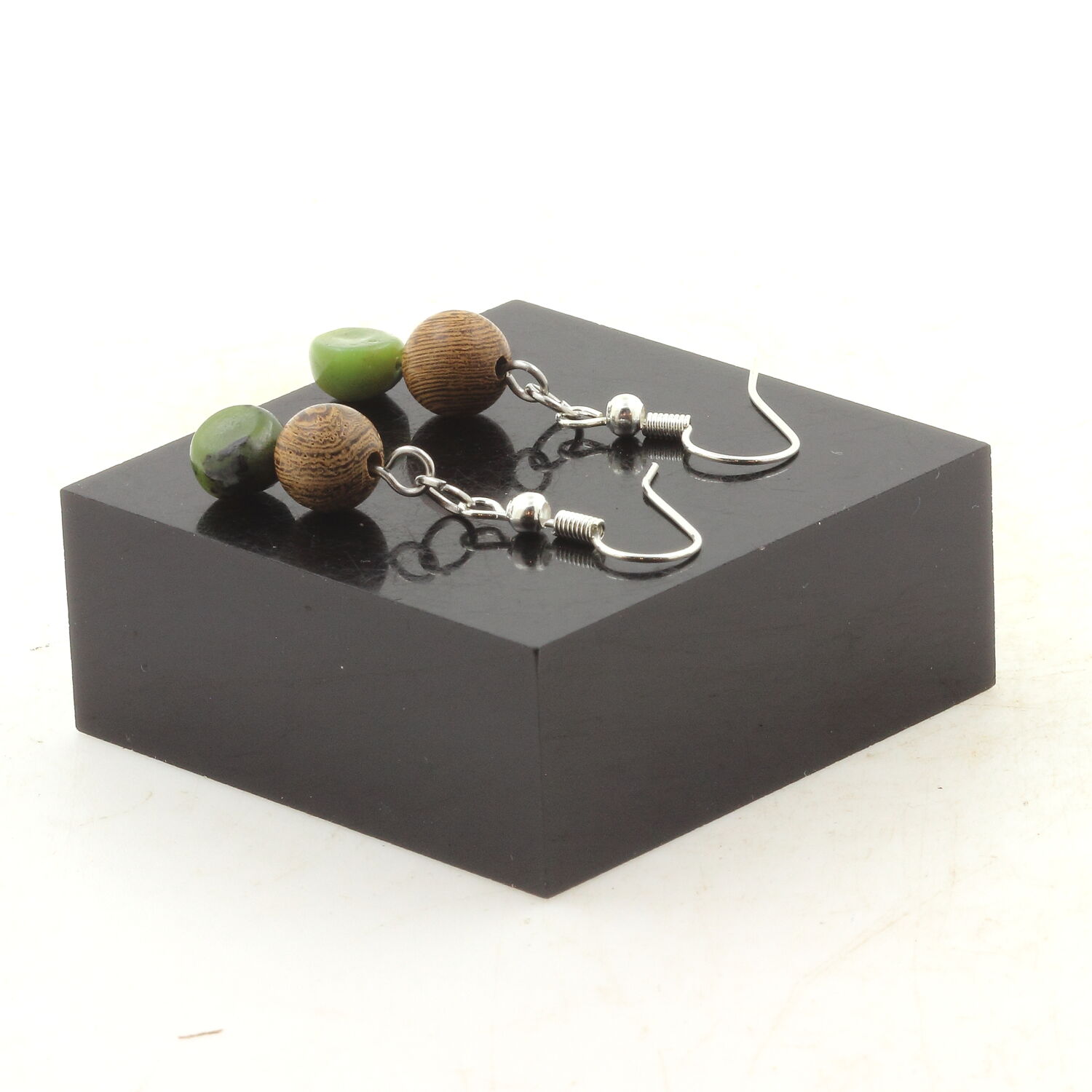 Stainless steel Earrings Jade Nephrite from Xiuyan China + wood 8 mm 2 Beads.