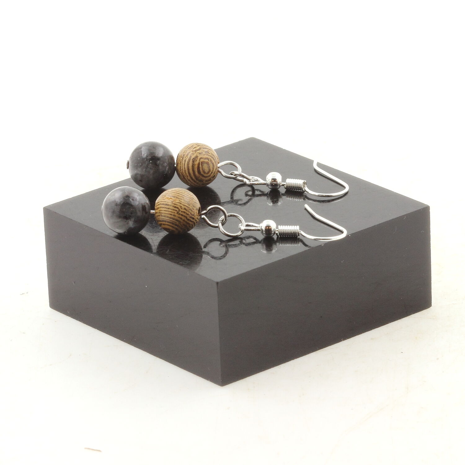 Stainless steel hypoallergenic Earrings Labradorite + wood 8 mm 2 Beads.