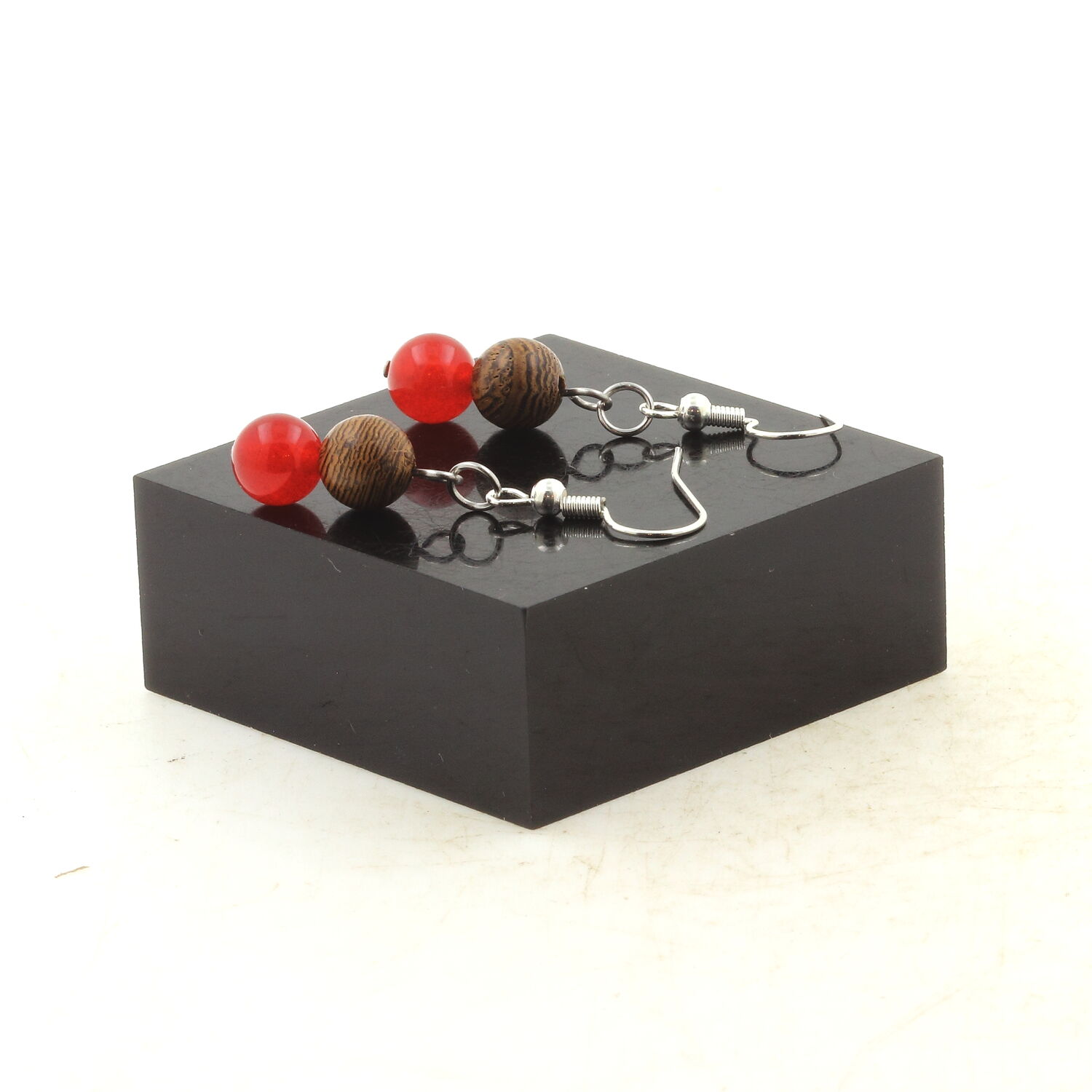 Stainless steel hypoallergenic Earrings Red Chalcedony + wood 8 mm 2 Beads.