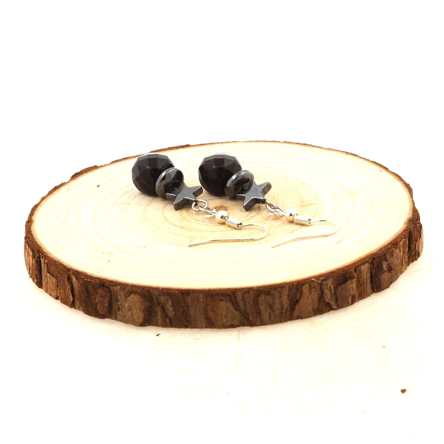 Stainless steel hypoallergenic Earrings Schorl Tourmaline 8.5-9 mm faceted cube shape 1 Bead + 2 Hematite Beads 8 mm.