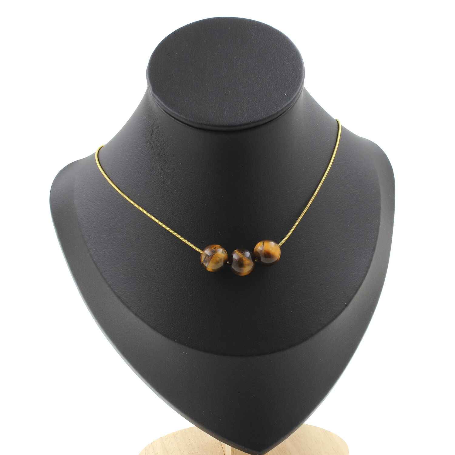 Tiger's Eye 10 mm 3 beads necklace, golden stainless steel chain length 45 cm. We can make it to your length on request. Made in France in our A Bijoux workshop. Delivered in a box pouch. Necklace for women, men, children. Discover more than 1000 models of necklaces made by the A Bijoux brand with new arrivals every day.