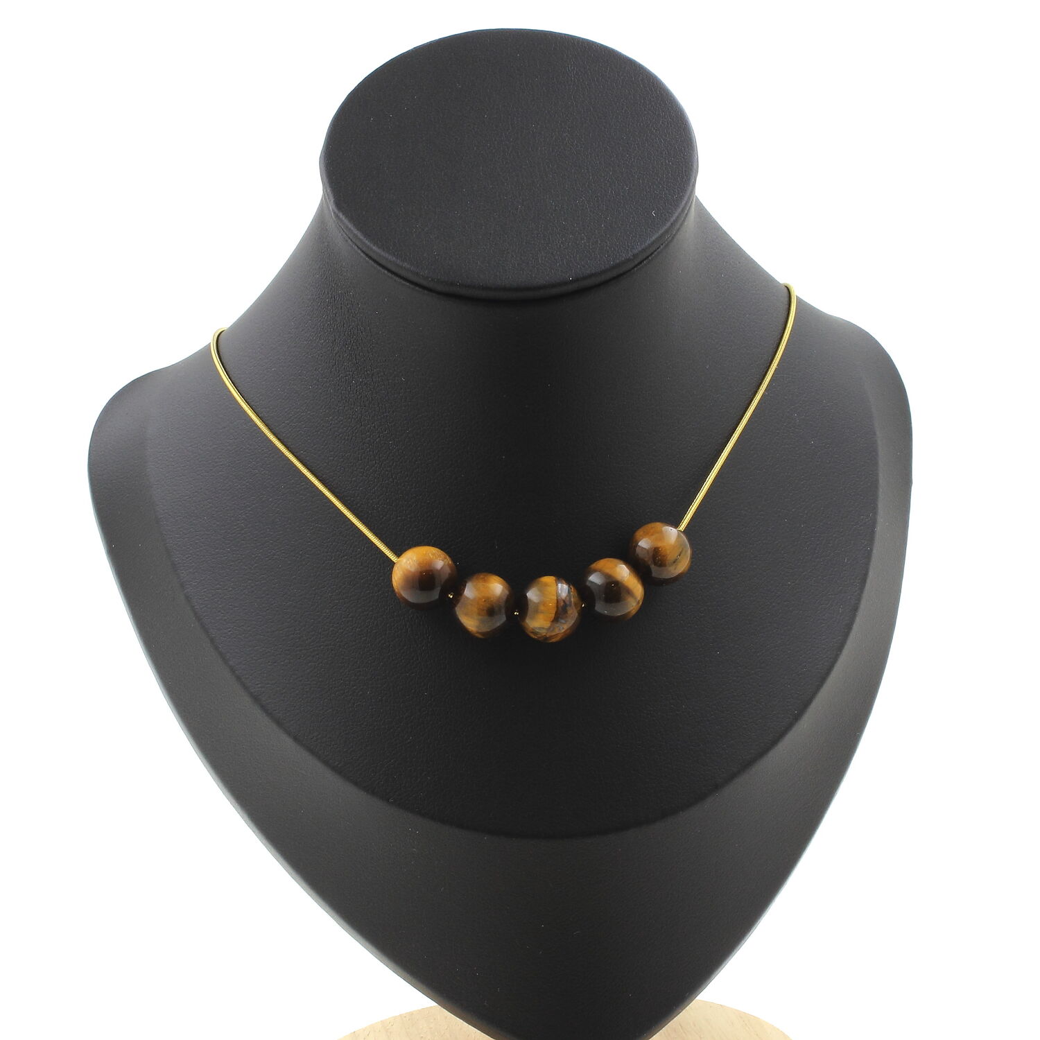 Tiger's Eye 10 mm 5 beads necklace, golden stainless steel chain length 45 cm. We can make it to your length on request. Made in France in our A Bijoux workshop. Delivered in a box pouch. Necklace for women, men, children. Discover more than 1000 models of necklaces made by the A Bijoux brand with new arrivals every day.