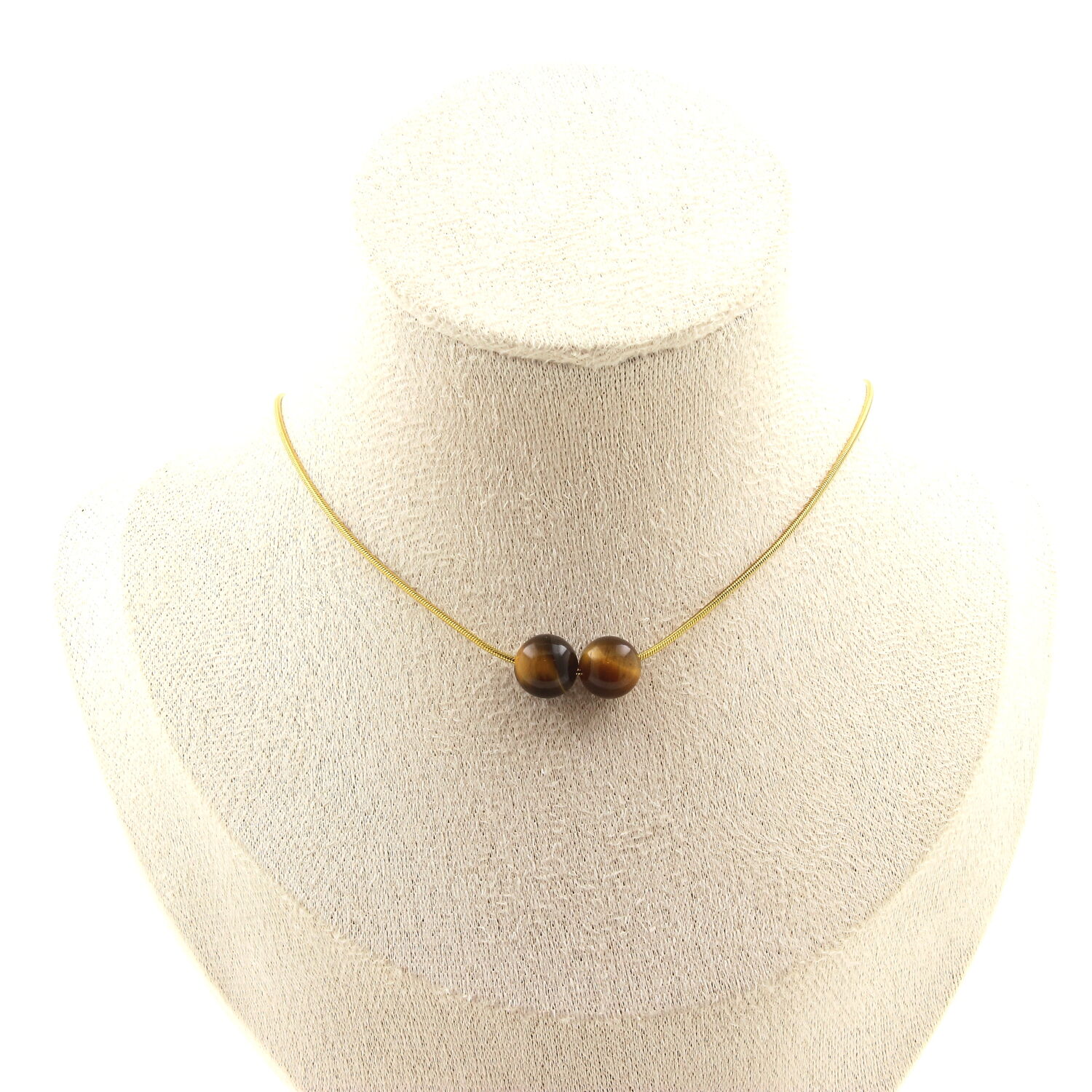 Tiger's Eye 8 mm 2 beads necklace, golden stainless steel chain length 45 cm. We can make it to your length on request. Made in France in our A Bijoux workshop. Delivered in a box pouch. Necklace for women, men, children. Discover more than 1000 models of necklaces made by the A Bijoux brand with new arrivals every day.