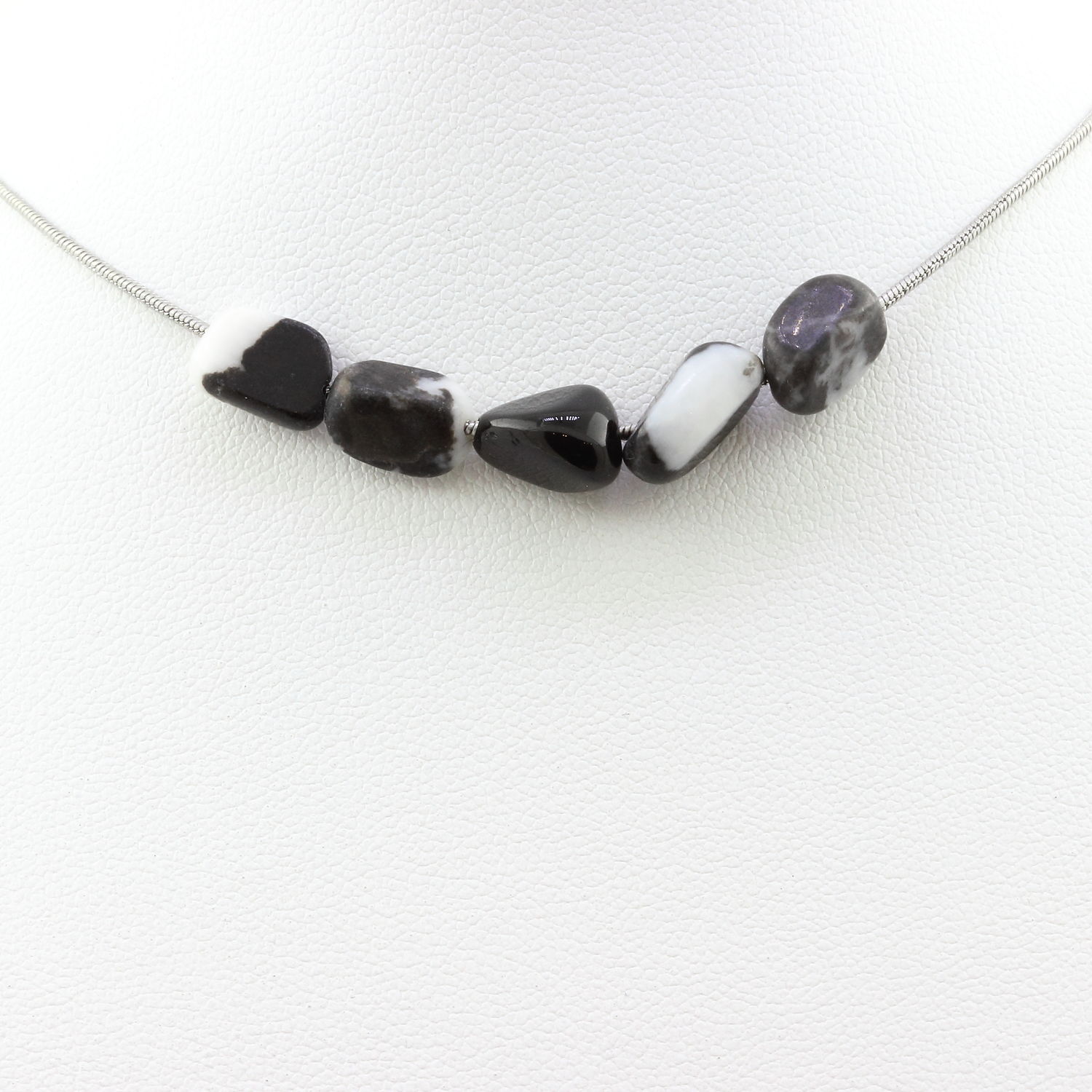 Zebra Jasper from Brazil + Hawk Eye beaded necklace, stainless steel chain length 45 cm. We can make it to your length on request. Made in France in our A Bijoux workshop. Delivered in a box pouch. Necklace for women, men, children. Discover more than 1000 models of necklaces made by the A Bijoux brand with new arrivals every day.